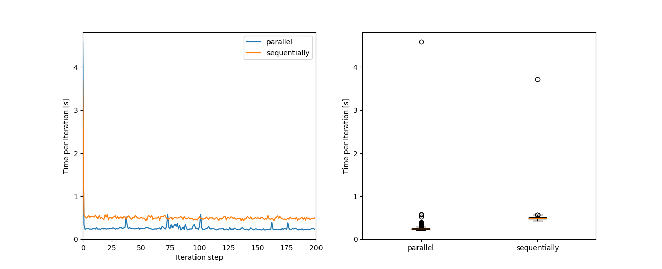 Surprise, surprise: the parallelized version is faster (roughly two times for my test settings.) That enhancing the speed is so easy with TensorFlow is indeed a surprise “cough” - and it wasn’t for sure with the old FIFO Queue. The initial step might take a bit longer (see the outlier in the boxplot), which I guess comes from filling the buffer, but for the rest, it runs quite a lot faster.