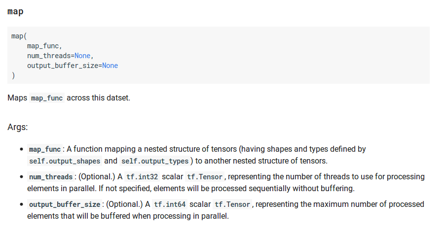 Documentation of the .map() function of the Dataset class from the official TensorFlow documentation